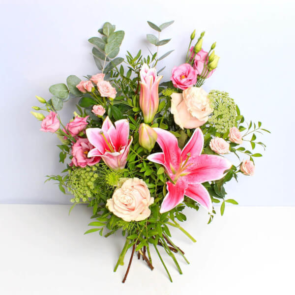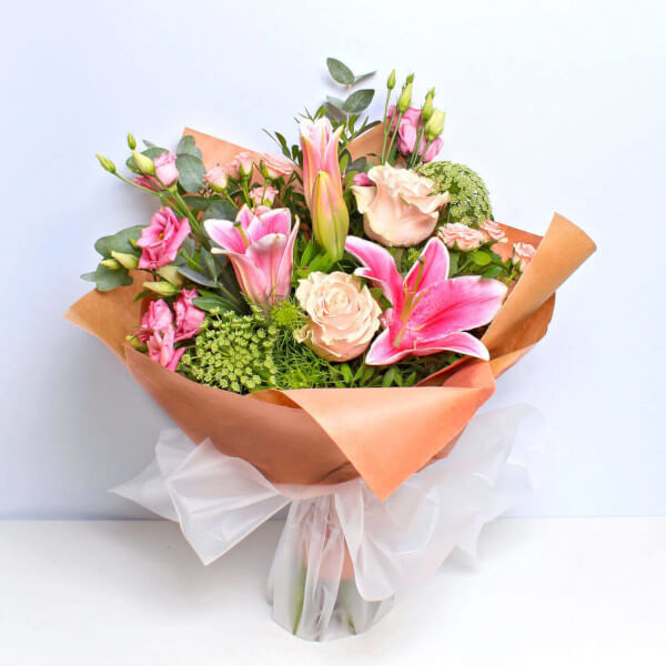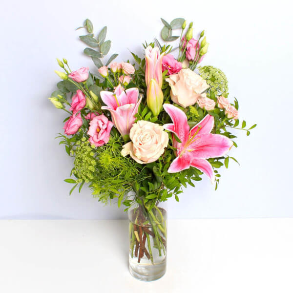 Surprise someone with this elegant display of pink lilies and roses. This is the perfect choice for a special birthday, or a little surprise to make someone’s day.
