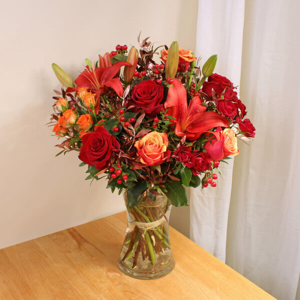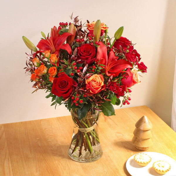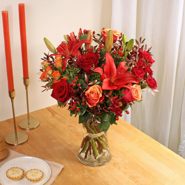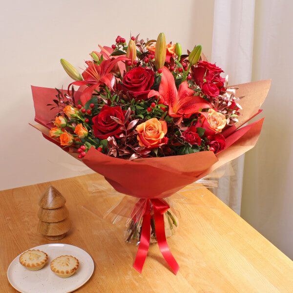 Complete the Festive season with our stunning Frankincense Luxury Hand tied Bouquet. The striking seasonal reds and oranges of this beautiful yule tide bouquet are guaranteed to add a splash of colour to your Christmas decor.