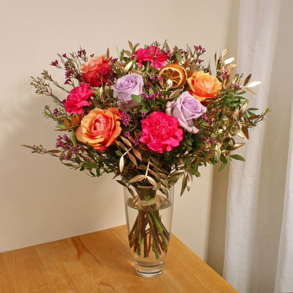 This quirky bouquet featuring Carnations and Roses, is a playful mix of colours designed to catch the eye. Playful and fun, this hand tied bouquet is bound to make them smile.