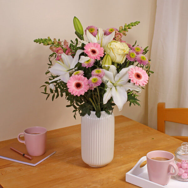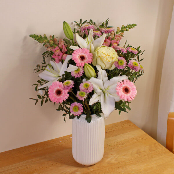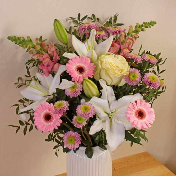 Spring is coming! This handcrafted combination of Gerimini, Antirhinum, Chrysanthemum and Lisianthus is just the trick to brighten that special someone’s day.