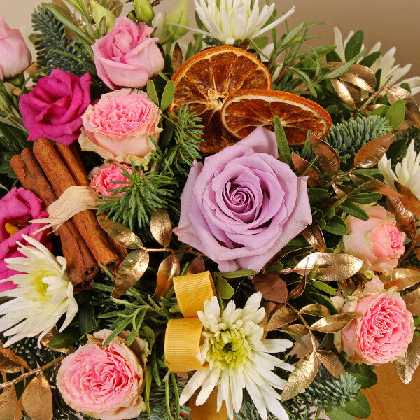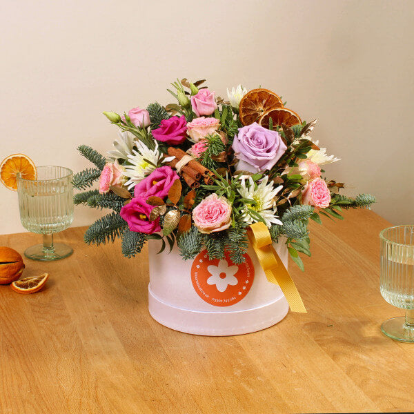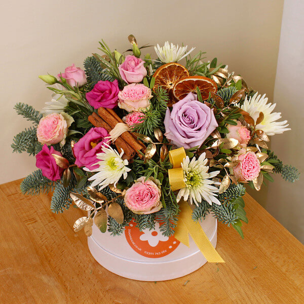 A stunning festive hatbox containing beautiful Christmas flowers such as Roses, Chrysanthemum Blooms and lisianthus, with luxury winter foliage and festive decorations. Lovingly created by your local artisan florist.