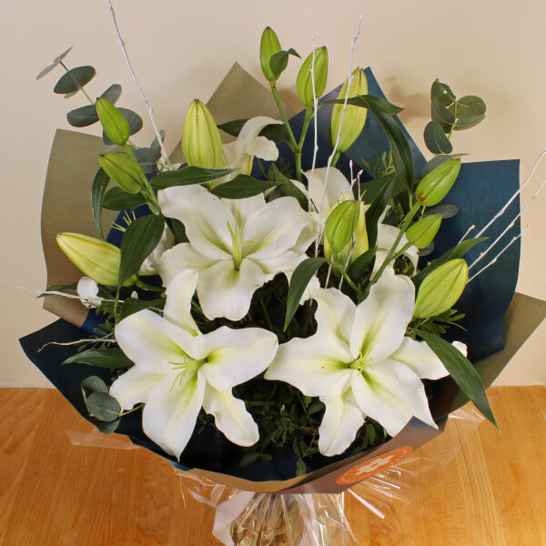 A simple and clean bouquet, these hand cut blooms are a prime example of seasonal flowers. Our white lilies are the best quality, and picked to last.